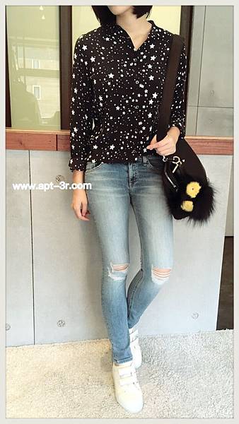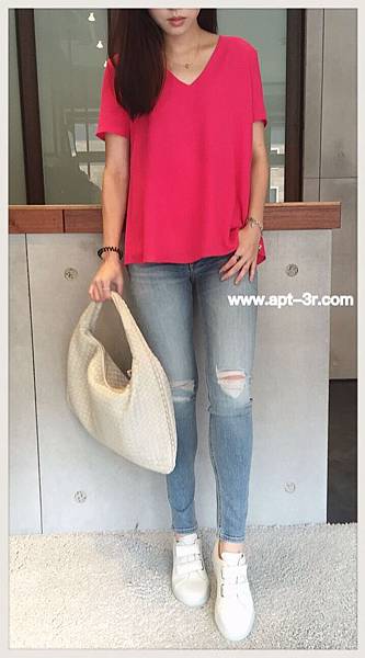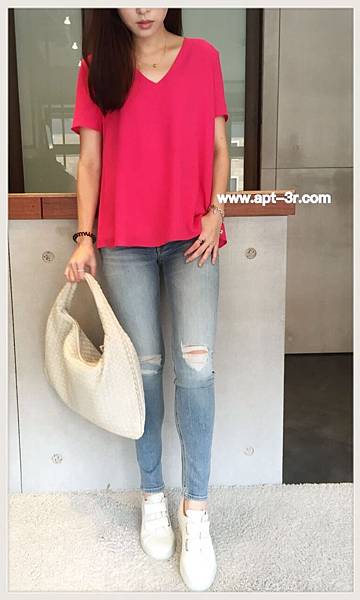 櫻花粉的柔與嫩,搭配上丹寧褲的俏麗,